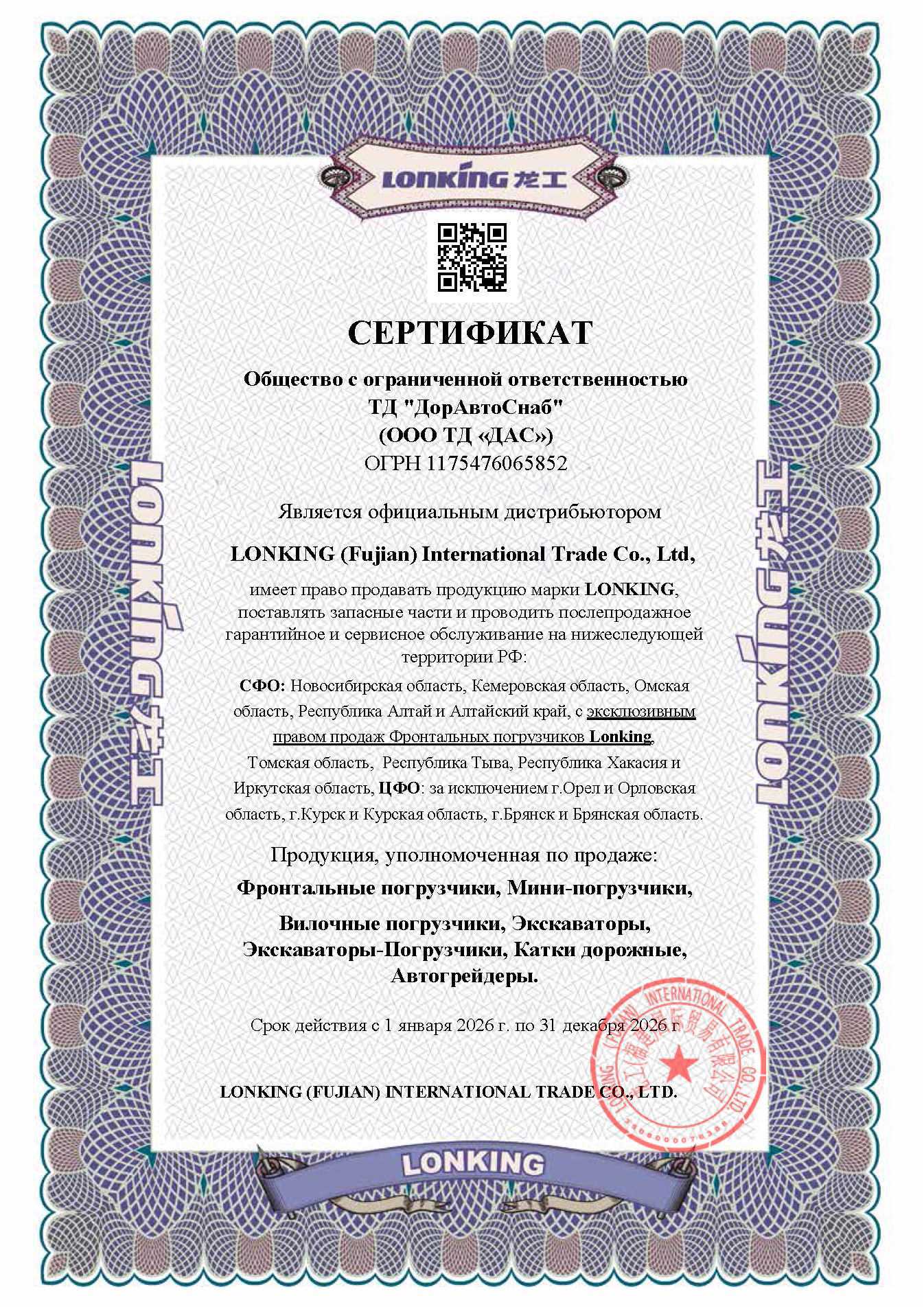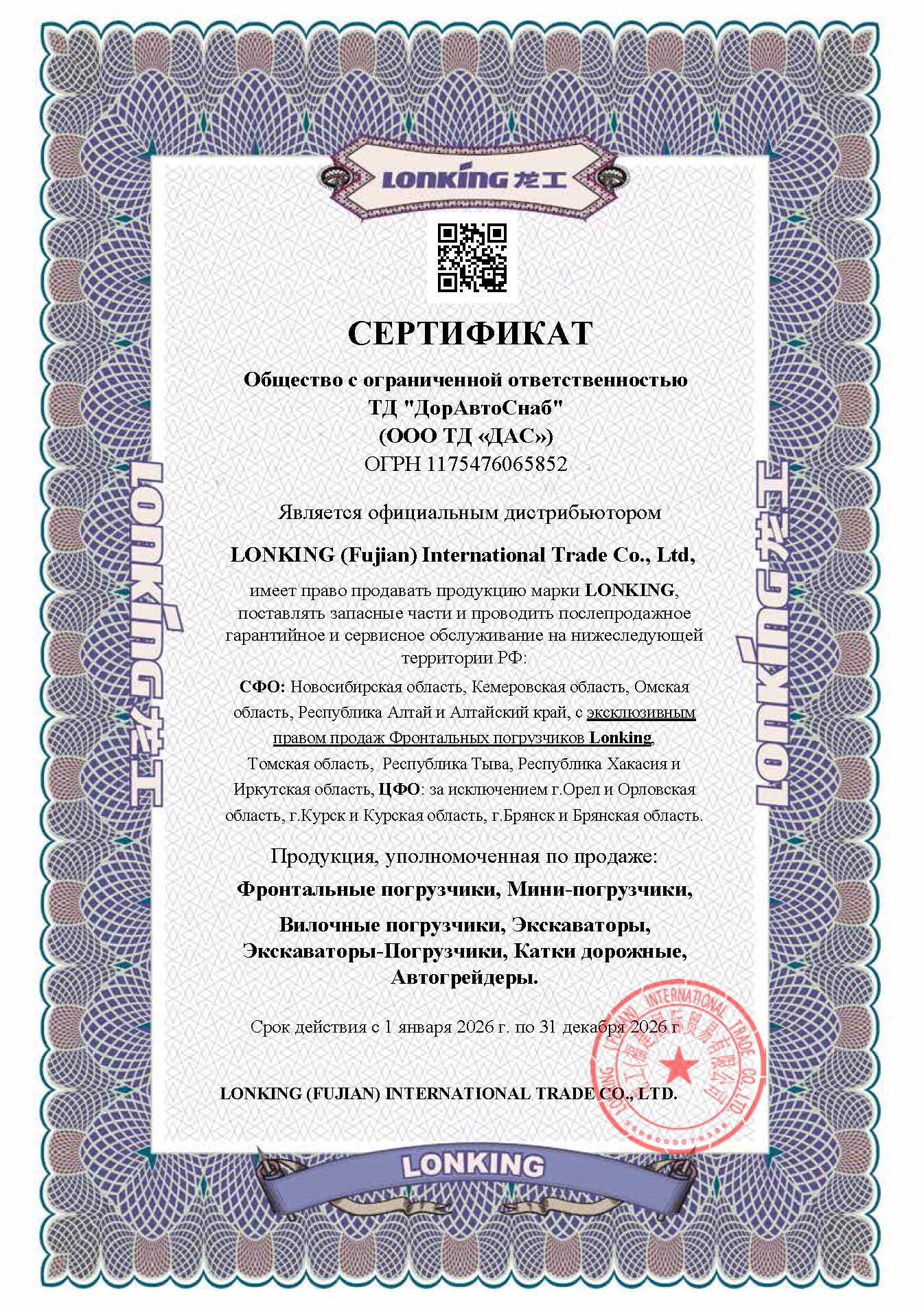 ООО ТД "ДорАвтоСнаб" является официальным дистрибьютором LONKING (Fujian) International Trade Co., Ltd, имеет право продавать продукцию LONKING, поставлять запасные части и проводить послепродажное гарантийное и сервисное обслуживание на нижеследующей территории: Новосибирская область, Кемеровская область, Омская область, Томская область, Республика Тыва, Республика Хакасия, Алтайский край, Республика Алтай.